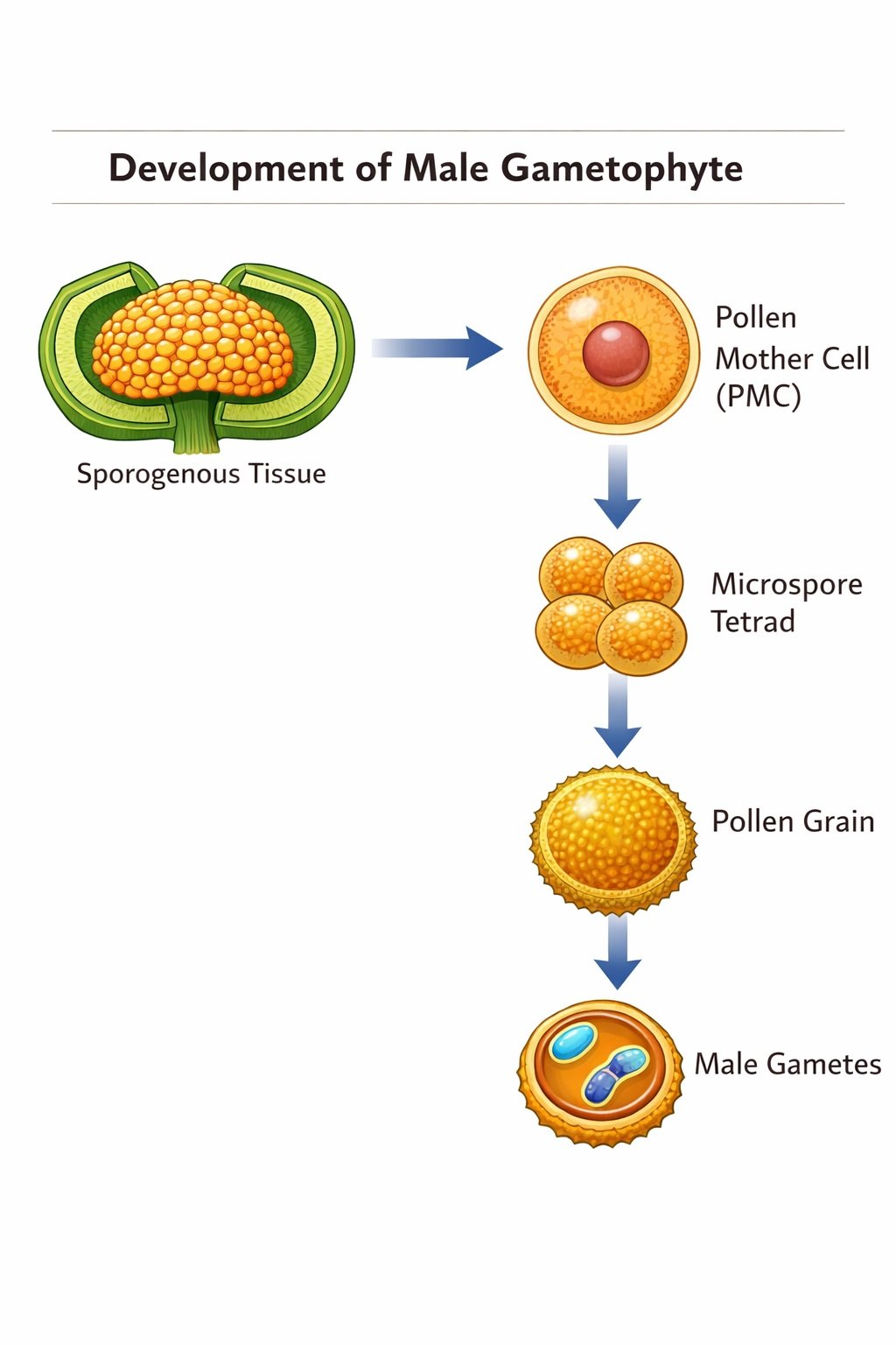 Pollen grain, sporogenous tissue, microspore tetrad, pollen mother cell, male gametes